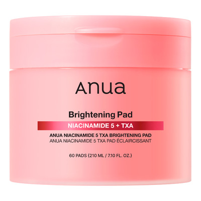 Anua Niacinamide 5 TXA Brightening Pad indeholder 5% niacinamid og tranexamsyre, som virker udjævnende på hudtonen. Pink vitamin B12, glycerin og aloe vera bidrager med næring og fugt, mens hyaluronsyre og hydrolyseret kollagen binder fugten i huden. Resultatet er en mere ensartet, hydreret og frisk hud.