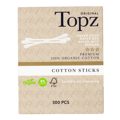 Topz Vatpinde er bomuldspinde af høj kvalitet, der er ideelle til korrektion og fjernelse af makeup. Selve pinden er fremstillet af FSC-certificeret papir, og enderne er lavet af blød og økologisk GOTS-certificeret bomuld. Disse vatpinde er et miljøvenligt valg, da både pindene og emballagen er biologisk nedbrydelige.