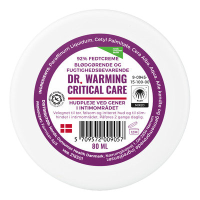 Dr. Warming Critical Care er en intensivt fugtighedsbevarende creme med et fedtindhold på 92%, der specielt er udviklet til intimpleje og meget sart hud. Den er velegnet til kvinder med tørhed omkring de ydre kønsorganer og kan anvendes ved gynækologiske lidelser som bl.a. Lichen Sclerosus, Lichen Planus etc. Cremen smelter hurtigt ved kontakt med varm hud, hvilket gør den let at fordele og behagelig at anvende. Derudover er den særligt god til strålebehandlet hud, da den skånsomt kan duppes på uden at irritere.
