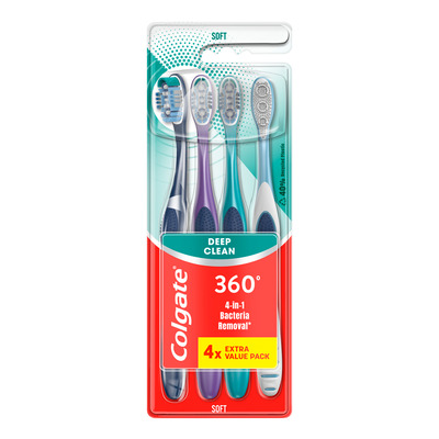 Colgate 360 Deep Clean Tandbørste soft er en 4-pak med bløde tandbørster, der rengør hele munden