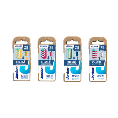 Jordan Change er en revolutionerende tandbørste med udskiftelige tandbørstehoveder, så du undgår at smide hele tandbørsten ud, når den bliver slidt. I stedet kan du nøjes med blot at udskifte børstehovedet hver tredje måned, når det bliver slidt. Disse tandbørstehoveder er lavet med medium bløde børstehår, der effektivt fjerner plak og bakterier, samtidig med de er skånsomme mod tandkødet.