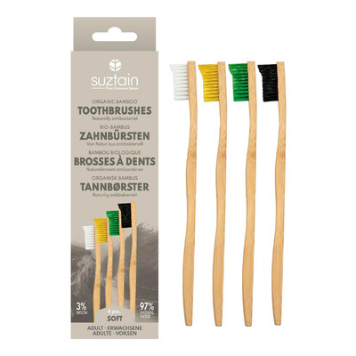 Suztain bambustandbørster i soft er et miljøvenligt alternativ til plastiktandbørster. Håndtaget er lavet af ansvarligt høstet Mosu bambus, som er naturligt antibakteriel og panda-venlig. Børstehårene er fremstillet af kvalitetsnylon og giver en effektiv og skånsom tandbørstning. Pakken indeholder fire tandbørster i forskellige farver og er velegnet til voksne. Tandbørsten opfylder ISO 20126:2012 standarden og har god holdbarhed.