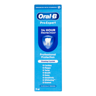 Oral-B Pro-Expert Professional Protection tandpasta er klinisk dokumenteret og udviklet i samarbejde med tandlæger. Den giver en ren følelse i hele munden og 24-timers beskyttelse mod plak ved regelmæssig børstning. Egenskaber inkluderer styrkelse af tænderne ved at remineralisere emaljen, dannelse af et beskyttende skjold mod bakterier og syrer, stærk myntesmag og genanvendelig emballage. En pålidelig tandpasta til en grundig mundhygiejne og plakbeskyttelse.