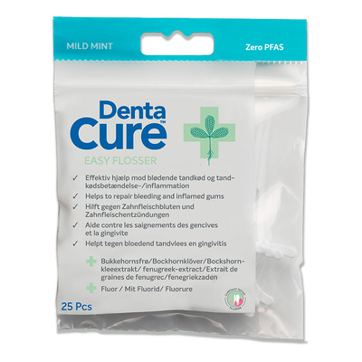 DentaCure Easy Flosser er en effektiv og naturlig løsning mod tandkødsproblemer. Denne flosser indeholder både tandtråd og tandstik, der er beriget med fluor og bukkehornsekstrakt. DentaCure Easy Flosser er udviklet til at glide let mellem tænderne, samtidig med at den frigør bukkehornsekstrakt og fluor, der forebygger tandkødsproblemer og karies.