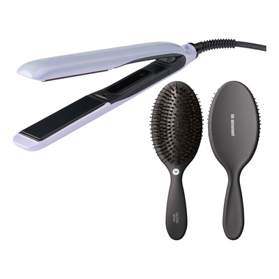 Medfølgende HH Simonsen Gloss Brush kombinerer fleksible børstepigge og ægte vildsvinehår, der fordeler hårets naturlige olier og giver øget glans. Børsten er ergonomisk designet med en 3D-konveks pude for optimal hovedbundsmassage. Glattejernet leveres med en varmeresistent opbevaringspose.