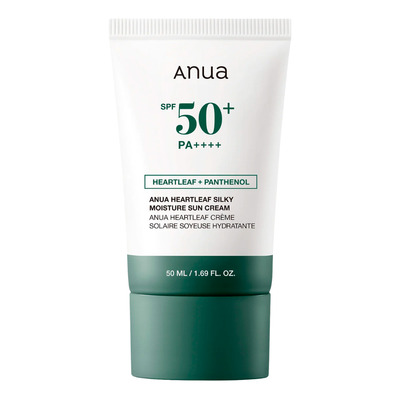 Anua Heartleaf Silky Moisture Sun Cream SPF50+ indeholder beroligende hjertebladsekstrakt og antioxidanter som quercetin og grøn te. Niacinamid bidrager til at mindske rødme og ujævn hudtone. Ingredienserne beskytter huden mod miljøpåvirkninger og hjælper med at forebygge fugttab og tidlige aldringstegn.