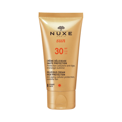 Nuxe Sun Delicious Cream SPF 30 er en let og effektiv solcreme til ansigtet med bredspektret beskyttelse mod både UVA- og UVB-stråler. Den absorberes hurtigt og efterlader huden blød uden fedtede rester eller hvid hinde. Solcremen er udviklet til sensitiv hud og tilfører fugt samtidig med, at den beskytter. Den sommerlige duft af appelsin, gardenia og vanilje gør brugen til en behagelig oplevelse.