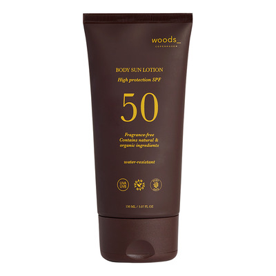 woods_ copenhagen Body Sun Lotion SPF50 er en effektiv og plejende solcreme til kroppen uden tilsat parfume