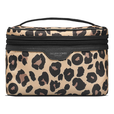 Gillian Jones Beautyboks i leopardprint er den ideelle løsning til opbevaring af dine skønhedsprodukter. Denne toilettaske er fremstillet af 100% genanvendt plastik. Den er designet med en gennemsigtig lynlåslomme i låget, så du nemt kan se, hvad der er indeni, samt en indvendig mesh-lomme til mindre genstande. Den måler L25,5 x H17 x B14 cm og er rummelig nok til alle dine nødvendigheder. Nylonmaterialet udvider sig efter behov. Den store lynlås-puller gør det nemt at åbne og lukke boksen og dens materialer tillader maskinvask ved 30 grader.