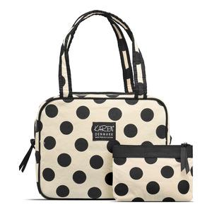 Dette 2-delte toilettaske sæt fra Karen består af en lille makeuppung, der er velegnet til mindre og skrøbelige ting, som du vil passe ekstra godt på. Derudover består sættet af en stor og rummelig toilettaske, der kan indeholde alle dine nødvendige produkter. Begge tasker er lavet i et fint, lyst design med mørke prikker og et Karen logo på fronten. Taskerne er lavet i økologisk bomuld og den store toilettaske er indrettet med fire indvendige lommer samt to hanke, der gør den nem at hænge op og giver et godt overblik over dine produkter.