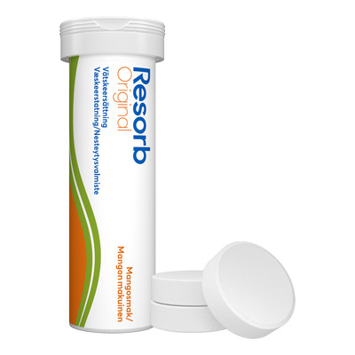 Resorb Original Mango er en kulhydrat-elektrolytopløsning i form af brusetabletter, der bidrager til at genoprette væske- og saltbalancen. Dette er et kosttilskud, som er udviklet til brug under eller efter fysisk aktivitet, hvor kroppens væskeoptagelse er ude af balance. Kombinationen af elektrolytter og kulhydrater understøtter kroppens naturlige evne til at optage væske mere effektivt.