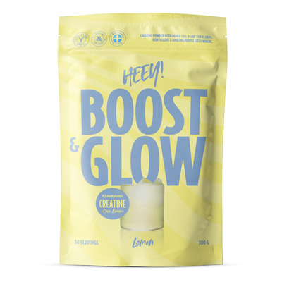 Heey! Boost & Glow Creatine + Coll-egan® m. Lemon er et kreatintilskud med plantebaserede ingredienser til huden